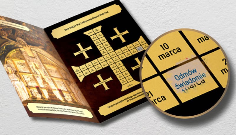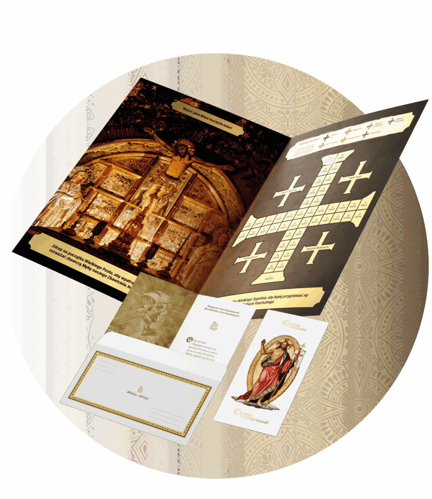 Pakiet zawiera „Wielkopostne wyzwanie” – zdrapkę na każdy dzień duchowego wzrastania, która za sprawą przygotowanych wyzwań pomoże Ci w dobrym przeżyciu Wielkiego Postu oraz tradycyjną, pięknie złoconą kartkę wielkanocną z ozdobną kopertą. Wyślij ją do bliskiej osoby wraz z życzeniami i kultywuj katolicką tradycję. Wartość pakietu wynosi 12 złotych (przesyłka gratis).